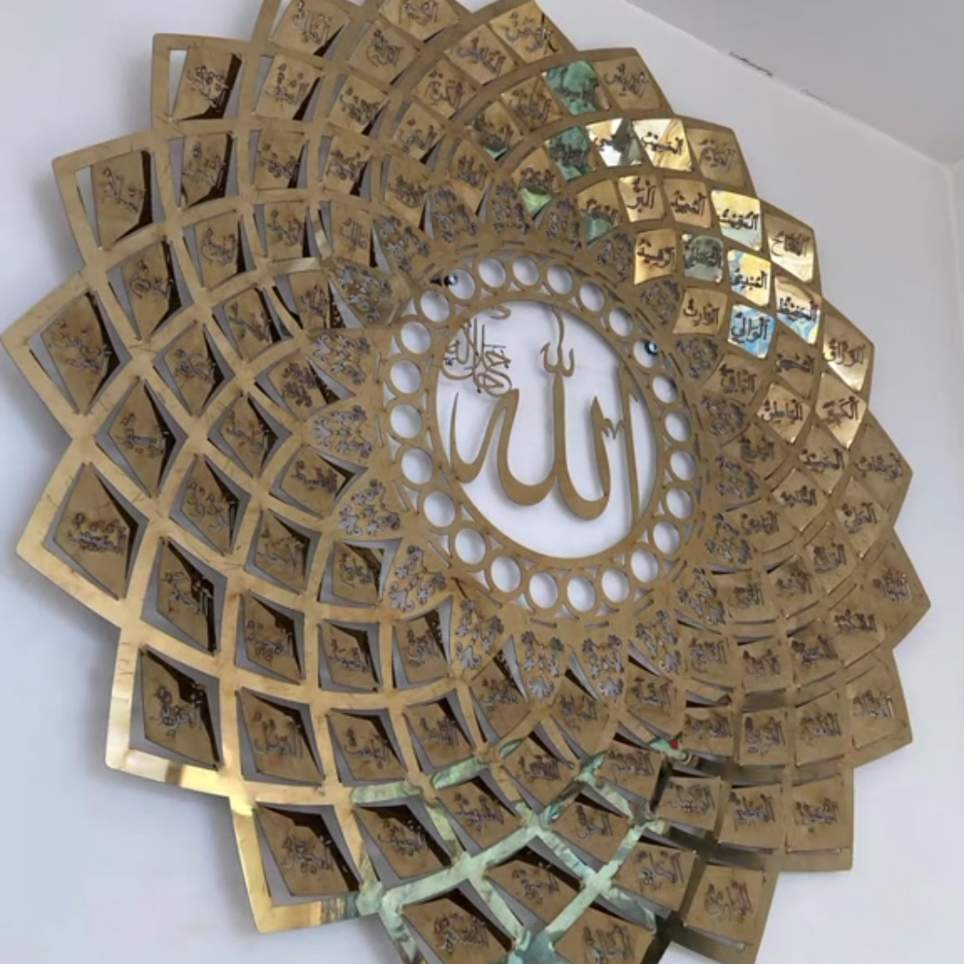 A beautifully crafted steel artwork featuring the 99 Names of Allah in an elegant mandala layout — designed to bring spirituality, depth, and timeless beauty to any space.